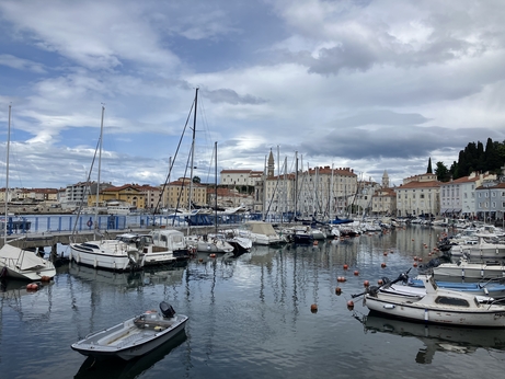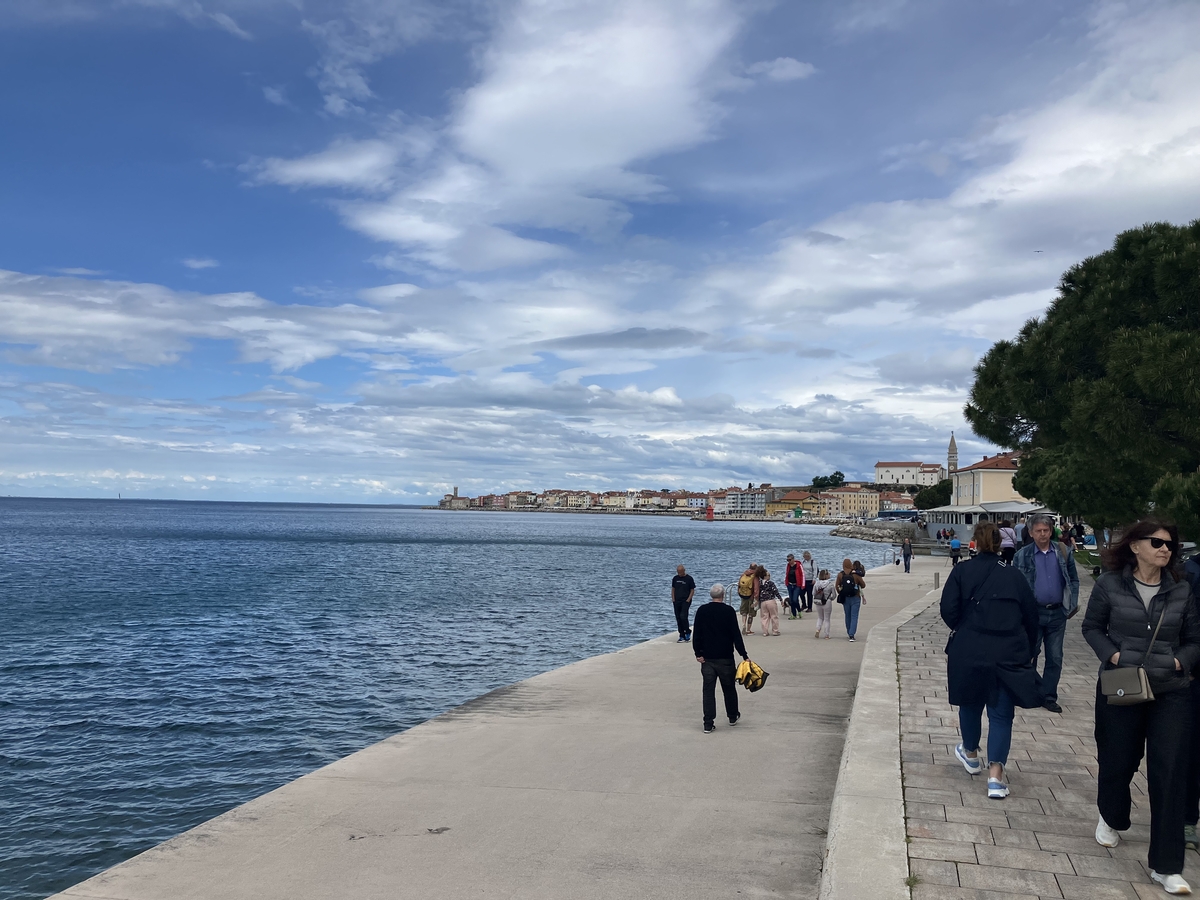 Kurz vor unserem Ziel, dem slowenischen Piran, mussten wir unsere Wagen in eine Garage stellen, da der Ort für den Verkehr gesperrt ist. Nachdem schlussendlich alle den richtigen Ausgang auf Meereshöhe gefunden hatten, spazierten wir gemütlich dem Ufer entlang ins Städtchen und trotzten dem heftig blasenden Wind. Wir wussten, weshalb wir eine Jacke dabeihatten! Mitten im Ort aßen wir auf einem kleinen Platz zu Mittag, wobei wir sehr lange warten mussten und am Schluss fast durchgefroren waren.