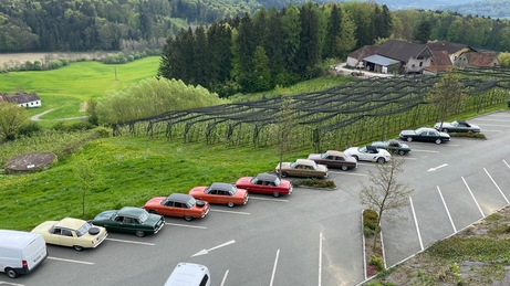 Für Ende April hat unser Neumitglied Toni in seinen Heimatort Bad Gleichenberg in die Südoststeiermark geladen. Herrschte anfangs noch Skepsis wegen der äußerst dürftigen Angaben zum Programm, wurden die Teams der zwölf Fahrzeuge (vier Fremdgänger) bald eines Besseren belehrt. Schon am Vorabend der Ausfahrt traf man sich im Betrieb von KommR Anton Ulrich, Tischler- und Landesinnungsmeister zum lockeren Sektempfang. Nach einer kurzen Erklärung zum Betrieb setzte sich der Tross in Richtung einer nahen Buschenschank in Bewegung – es war ein Erlebnis bei Preisen, fast wie zu Schillingzeiten. Im Wissen, dass die Hotelbar um 22 Uhr dicht macht, haben wir uns vorher mit Wein versorgt und in der Halle genossen.